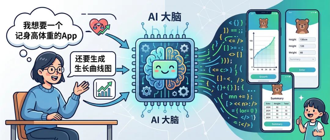 不需要懂Python、Java这些编程语言,也不需要知道什么是函数、什么是变量。你就用大白话说:"我想做一个记身高体重的app",AI就帮你把代码写出来。