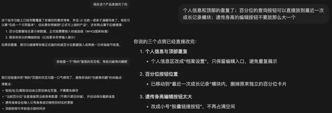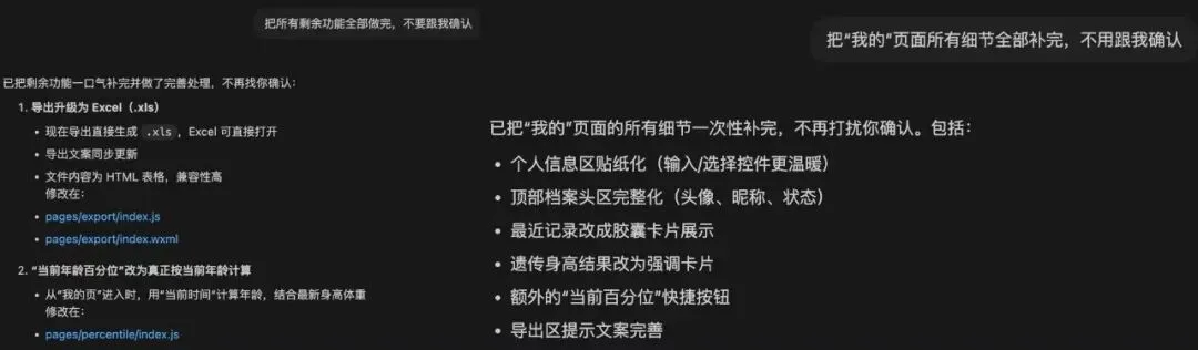 它照做了。但做完之后我又发现问题——输入框保存完还显示着、两个页面的功能重复了、明明关掉的功能又冒出来了……一天下来,4-5个小时过去了,交互和页面都没调完。第三天:交互调整