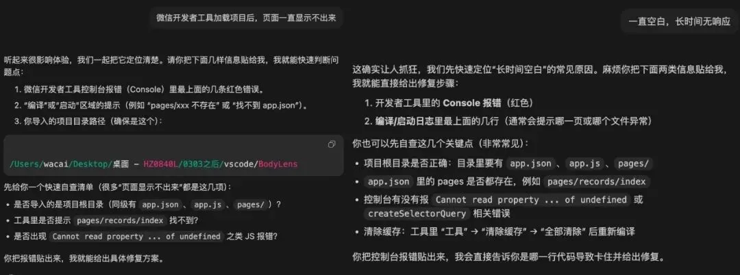 问题排查?把报错信息给它,它帮我分析原因。一开始微信开发者工具打开项目有个页面一直显示空白,是AI一步一步教我排查问题,最终定位到问题,然后改掉。这些我完全不会,有它带着,起码能走下去。UI细节?它一直在调那些看不出差别的参数,但明显的问题却不动。我花大量时间在"告诉它该怎么改",而不是"让它自己改"。代码之外