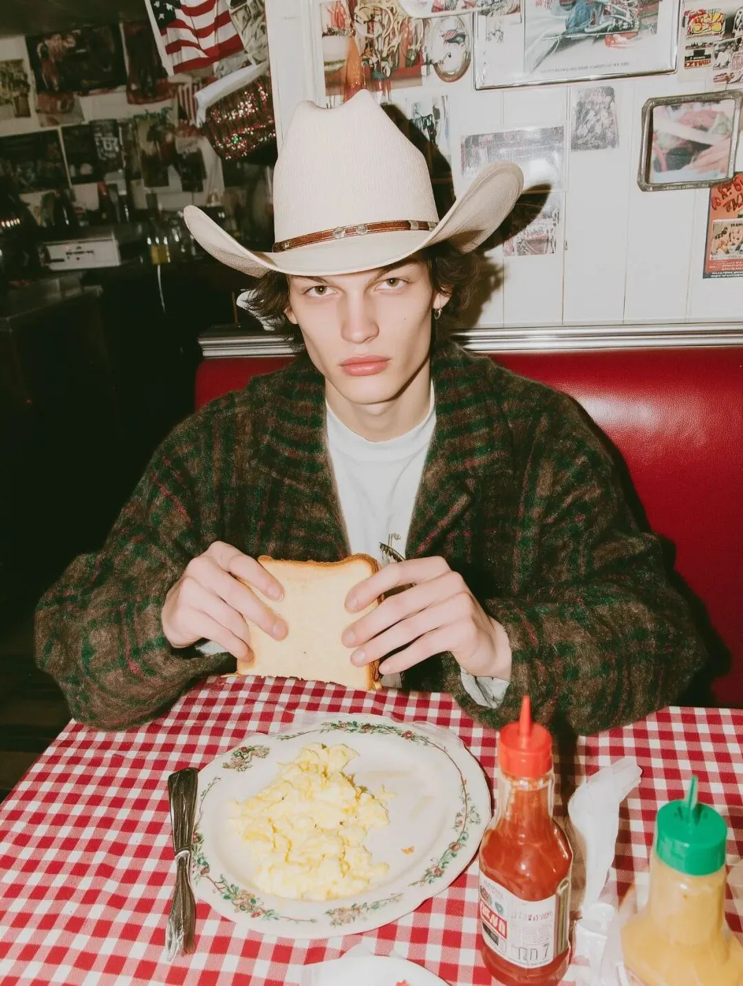 fashion editorial photo of a young man in a cowboy hat sitting at a diner table tearing a slice of toast in half with both hands, visible fingers and natural hand position, scrambled eggs on a plate, ketchup and mustard bottles on a red checkered tablecloth, vintage americana diner interior, flash photography, neutral color balance, minimal clutter