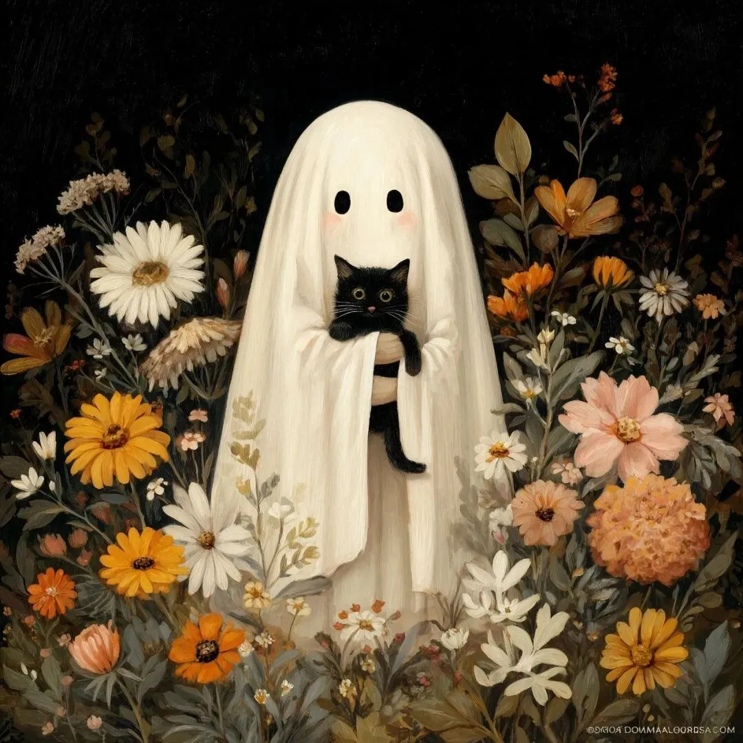 Aspect Ratio: 1:1Overall Style and Atmosphere:** This is a Halloween-themed illustration brimming with a sense of comfort and healing. It features the texture of a vintage oil painting, an elegant and fresh aesthetic, and a warm, inviting atmosphere.Subject and Details:** 1.Core Subjects:** The Ghost and the Black Cat The visual focal point of the image is a classic sheet ghost: The sheet ghost is tall and slender, featuring two round black eyes but no mouth; its soft, rounded silhouette gives it a charmingly naive and endearing appearance. Cradled in the ghost's hands is a small black cat. The ghost holds the kitten by its two front paws--a delightful pose that blends seamlessly with the ghost's form, serving as the perfect finishing touch that brings the entire composition to life.Background:** Vintage Floral Motif Behind the ghost lies a lush background of vintage-style wildflowers, rendered with the authentic texture of a classical oil painting, with the flowers appearing to grow upward from the bottom of the frame. Set against a deep black backdrop, a variety of flowers--including white daisies, yellow sunflowers, orange wild chrysanthemums, small pink blossoms, and white anemones--grow upward in a dense, lush arrangement of varying heights. The color palette is soft and vintage-inspired--featuring warm yellows, orange-reds, deep crimsons, creamy whites, and ginger-yellows--which contrast beautifully against the dark background. This creates the serene atmosphere of an autumn garden, offering a gentle visual harmony that complements the ghost's adorable charm. The ghost appears to be standing amidst a dense thicket of flowers; indeed, some blossoms can also be seen growing in front of the ghost.Style and Mood:**Fusion of Styles:** The combination of the ghost motif and the vintage oil-painting florals creates a unique Dark-but-Healing aesthetic. It successfully incorporates classic Halloween ghostly elements without evoking any sense of horror or fear; instead, the image radiates an overwhelming sense of tenderness and therapeutic comfort.16k