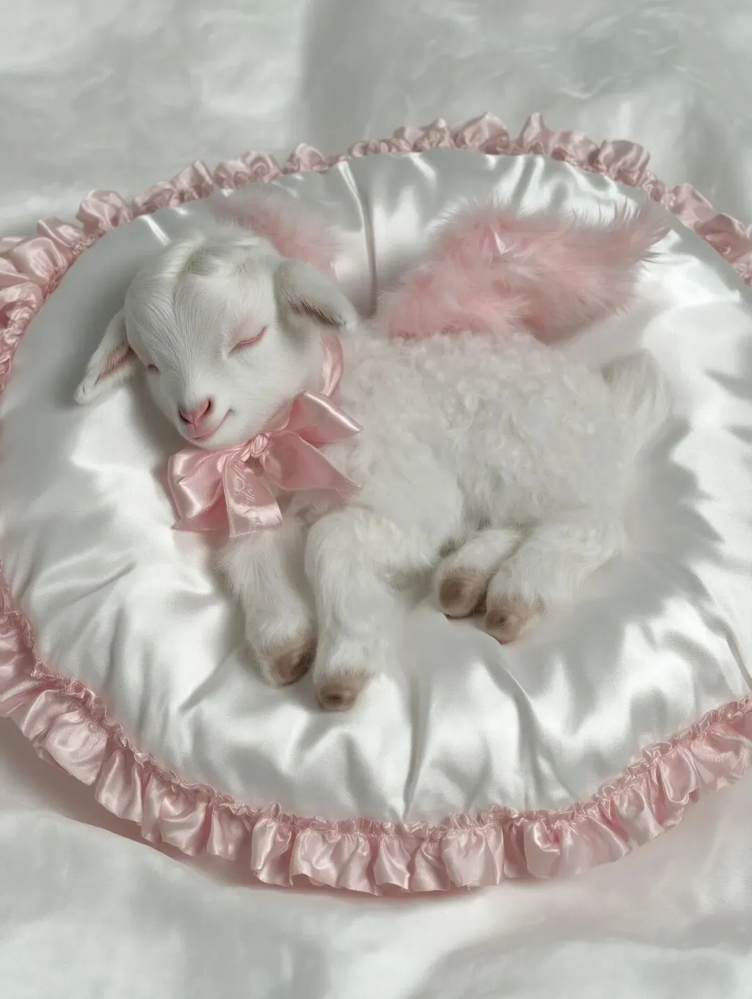 Ultra-realistic full-body, very wide full-shot photograph of a tiny white baby goat with soft feathered algel wings, wearing a pale pink ribbon tied around its neck, sleeping peacefully. The baby goat is fully visible from head to hoof, lying naturally on a pure white silk pillow, with generous negative space surrounding the subject. Camera positioned high in the air, distant overhead viewpoint, clean top-down aerial shot, no perspective tilt. The pillow and the baby goat are perfectly centered and symmetrically aligned, viewed straight from above. The entire pillow is fully visible and placed on a clean white bed, with the bed surface and surrounding bedding clearly shown and evenly framed. The silk pillow appears luxurious and realistic: glossy satin sheen, natural wrinkles, couture craftsmanship, ruffled edges, delicate gathers, and small pale pink rose details on the corners. The baby goat's fur is highly detailed and photorealistic, fine individual hairs visible, soft baby texture, natural ivory-white tone, subtle shadows between curls. Eyes gently closed, relaxed limbs, natural sleeping posture. Soft natural daylight, calm studio environment, realistic exposure and soft shadows with gentle falloff. Background: airy white bed with extremely pale blush-pink tones, softly blurred, minimal, clean, and evenly lit. Mood: angelic, innocent, girlish, tender, quietly sacred yet grounded in reality. Professional editorial animal photography, luxury fashion magazine quality. Shot on a full-frame DSLR, 35mm lens, f/4, high-altitude wide framing, natural depth of field, ultra-high resolution, authentic professional photograph.