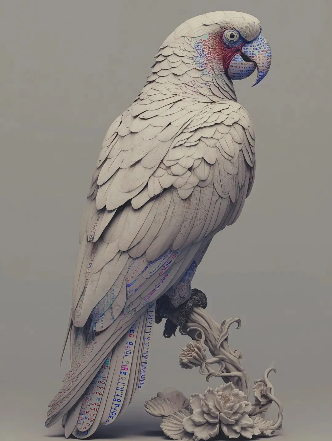 droid parrot, product photography, iconic white robotic parrot, large multicolored Python code on the feathers, gray background, centered
