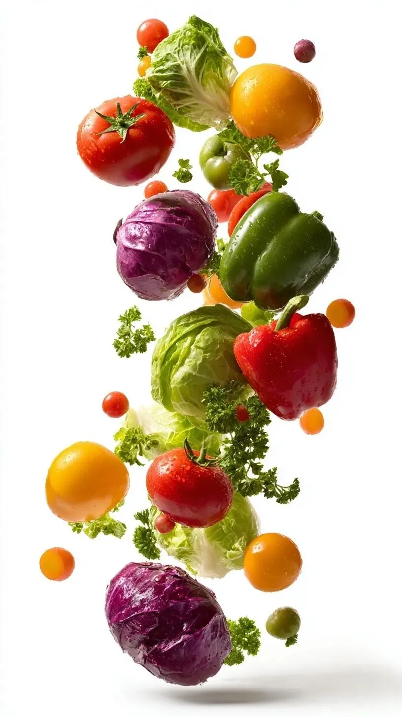 Isolated on white background fresh vegetables falling in air, slow motion capture, bright lighting with vibrant color accuracy, minimal shadow, clean commercial look
