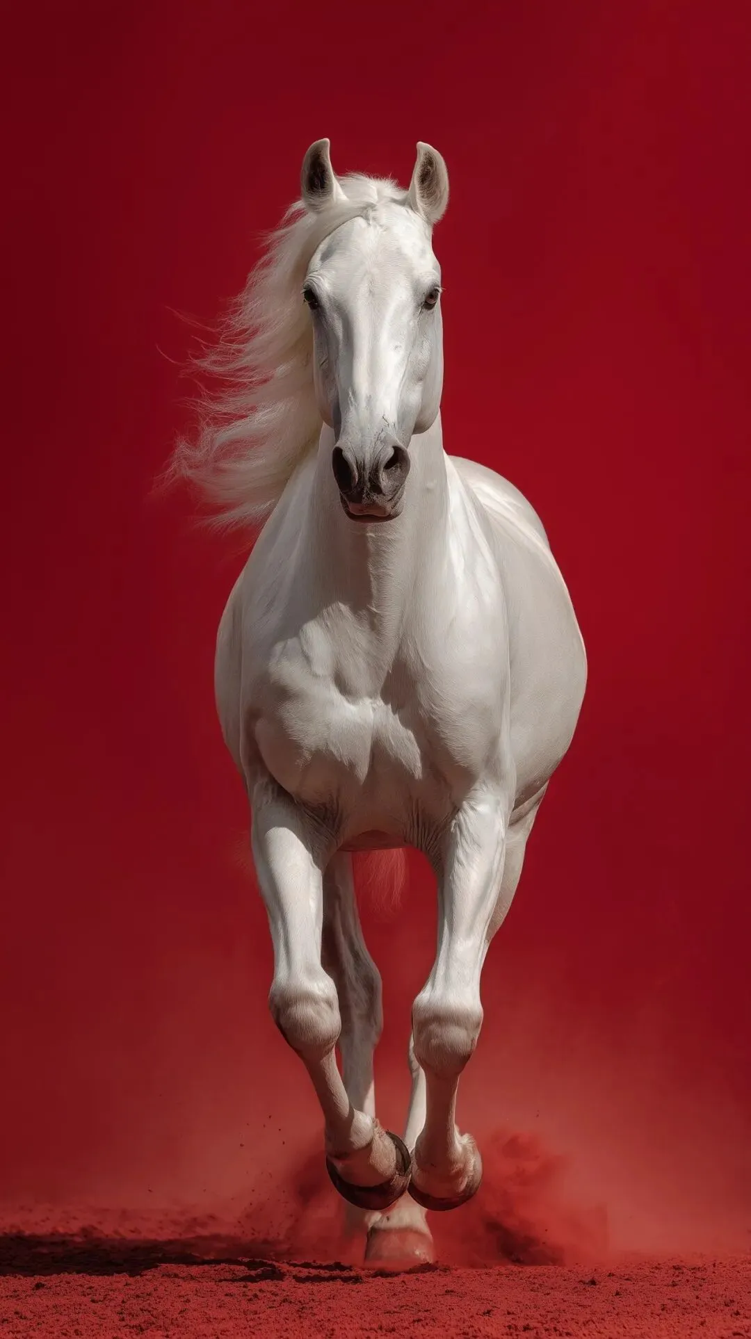 a white horse, full-body photograph, front view, against a red background, in a running posture, high-definition photography, high resolution, high detail, professional color grading, soft shadows, low contrast, clean, sharp focus.