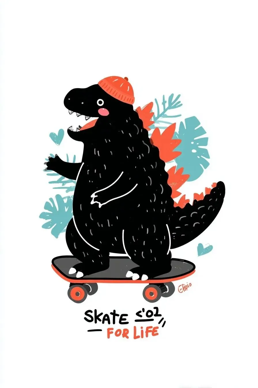 Kawaii Godzilla auf einem Skateboard. In koreanisch steht dabei Skate for Life. Motiv isoliert auf weißem