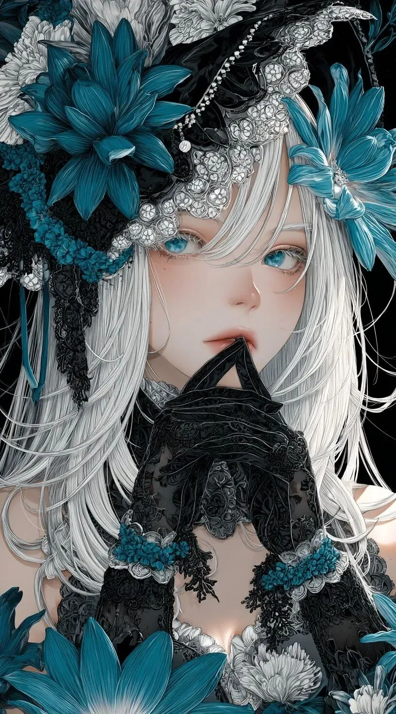anime style illustration of an anime girl with long white hair and blue eyes wearing black lace gloves, she is holding her finger to his lips in the shape of sh '\' , with teal flowers around him, with a hat on top of head with silver details, high resolution, high quality, high detail, sharp focus, studio photo, intricate details, highly detailed, cinematic lighting, octane render,