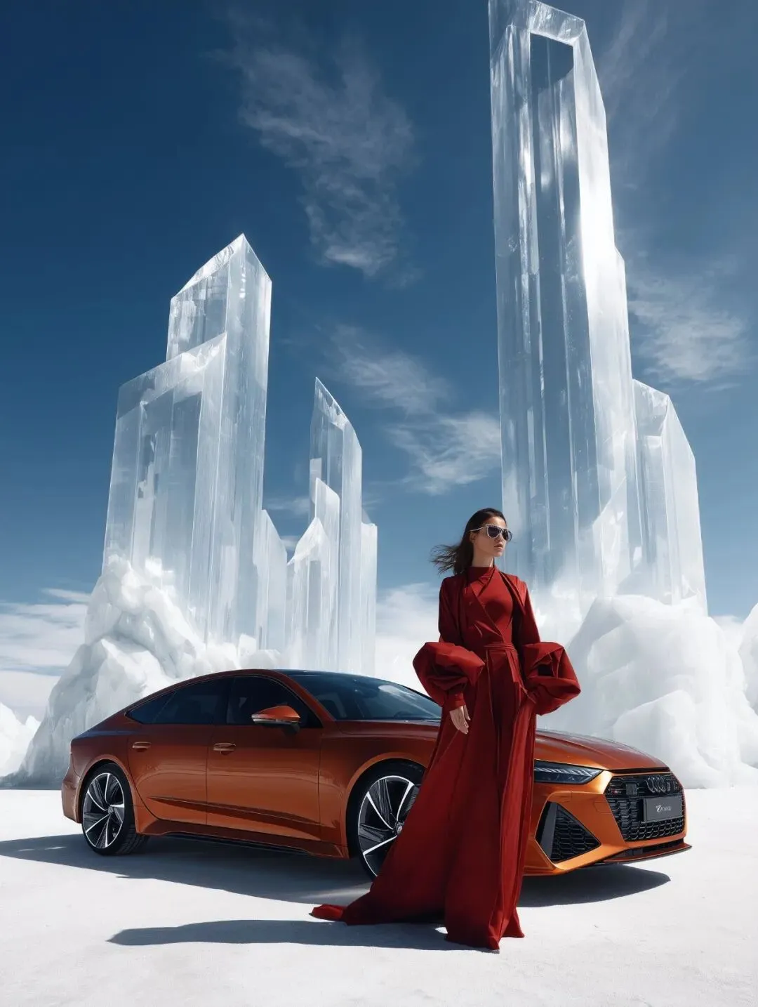 high-end fashion automotive editorial, dramatic high-angle wide-angle shot, a glossy orange luxury sedan displayed in front of towering clear crystalline structures, suspended in mid-air, glowing softly with reflections. The model stands confidently in the foreground, wearing a sculptural gown in deep crimson red, with a strong silhouette, face partially obscured by hair movement, creating a powerful runway attitude. The environment is a surreal outdoor daytime scene, with bright white crystalline structures surrounding the car, reflecting soft light. The background features a bright azure sky, free of green or blue hues, creating a sharp contrast with the car and model, giving the scene a high-contrast, cinematic, dreamlike atmosphere. The color palette is harmonious, with rich crimson red tones on the model’s gown, vibrant orange tones on the car, and clear crystals that glow in the bright sunlight, creating a striking contrast and unified aesthetic. The scene showcases clean minimalism, bold spatial contrast, cinematic composition, no text, no watermark, vertical 4:5.