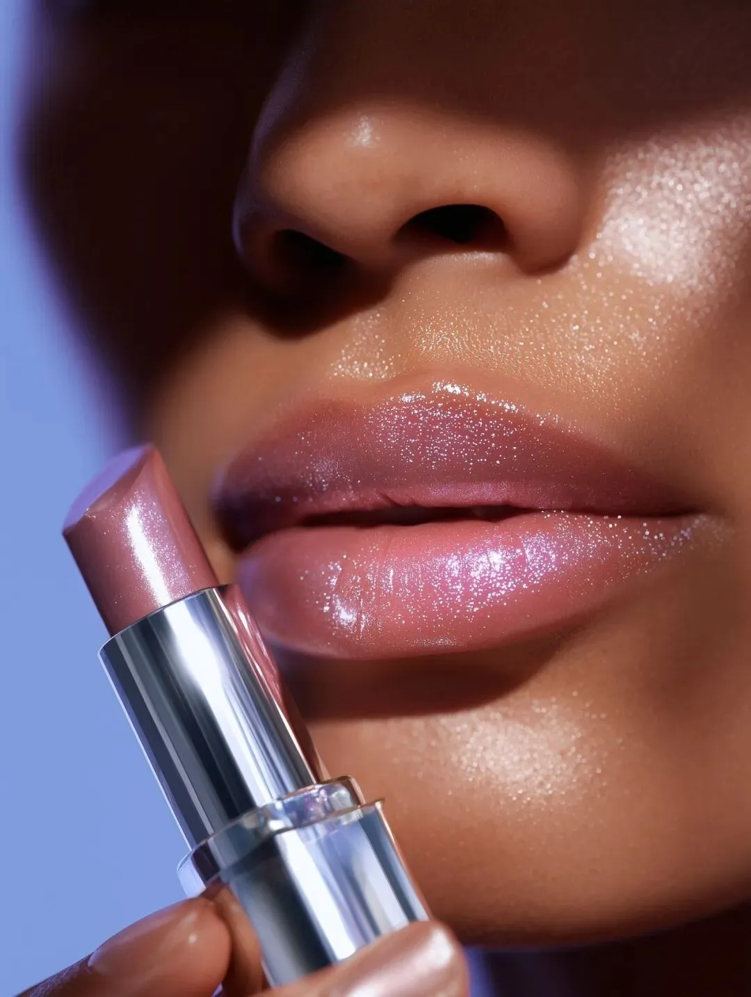 Realistic female close-up portrait holding a luxury lipstick, elegant hand gesture framing the product, flawless glowing skin, smooth reflective surfaces, soft pastel background, refined futuristic premium aesthetic, soft diffused lighting, no harsh shadows, shallow depth of field, shot on Hasselblad H6D, hyperrealism, 8K