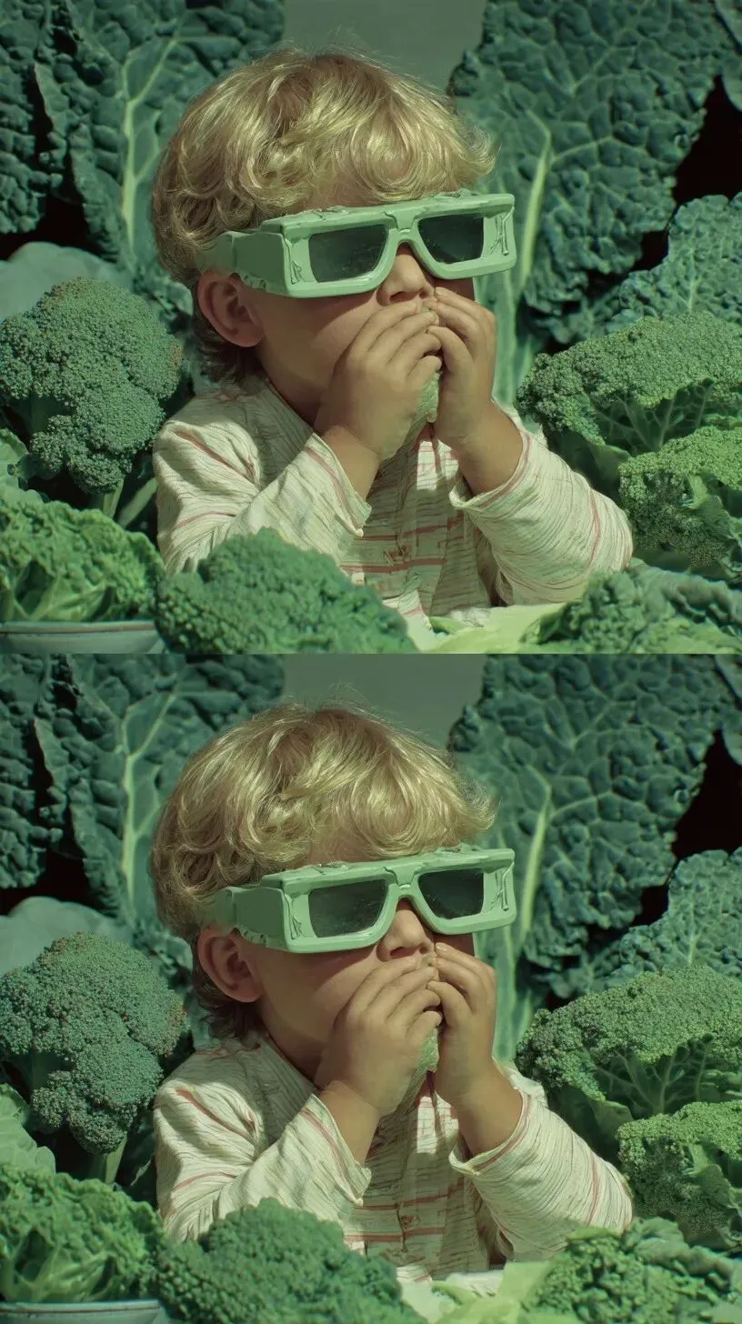 A 3D stereoscopic picture of a child experiencing juice extraction from kale vegetables