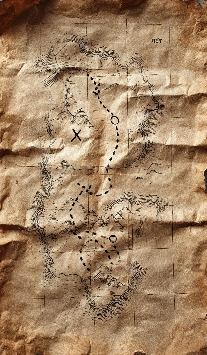 an unfolded pirate treasure map with a dotted path line drawn in and a big X to mark the treasure spot, parchment paper, comic book style,