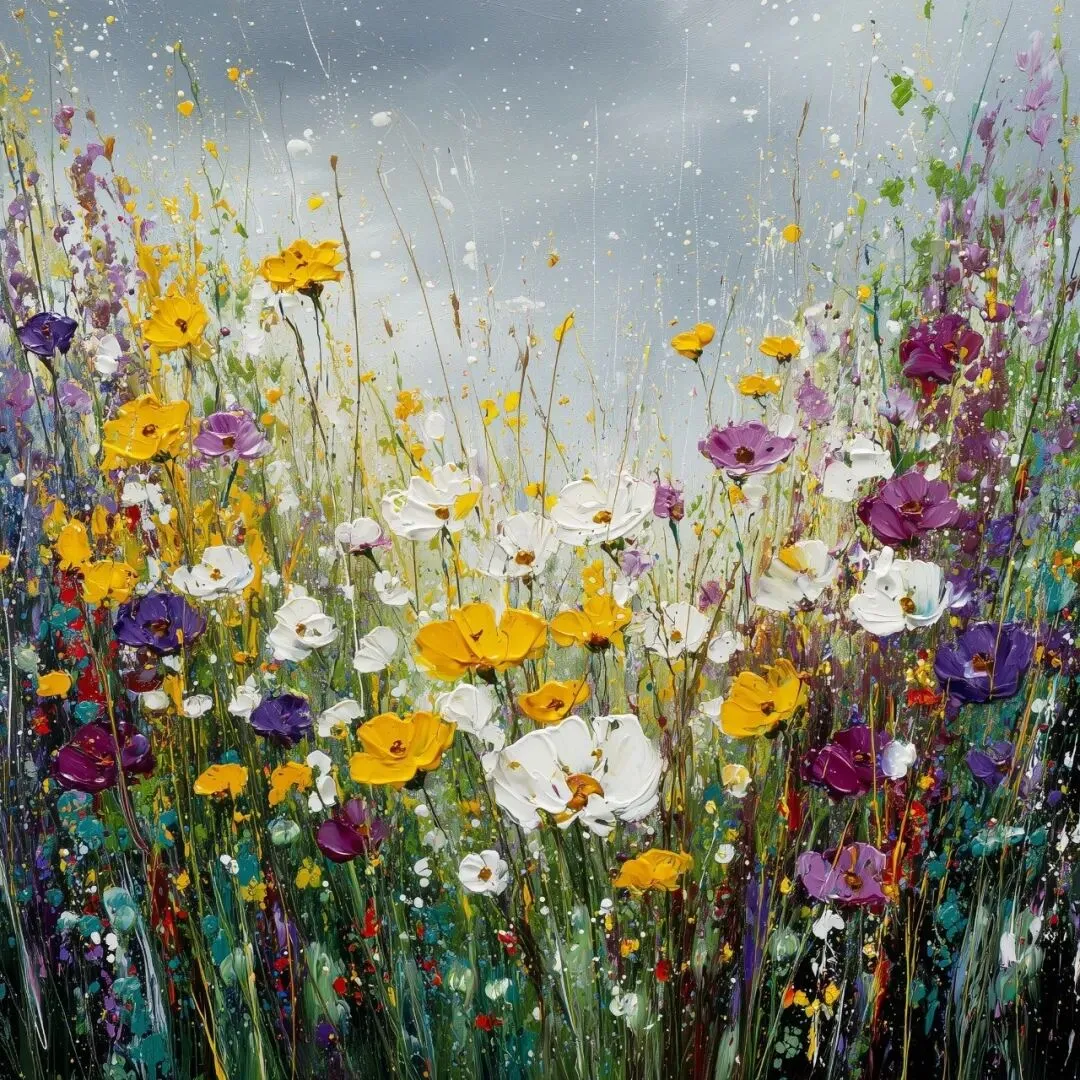 A highly stylized oil painting of wild flowers, inspired by yvonne coomber, with texture of paint that adds depth and movement to the dramatic setting, with primary palette colours that really pop. captured with dramatic brushstrokes, dramatic white brushstrokes to create depthand dimension with dramatic paint splats. An organic feeling to the art.