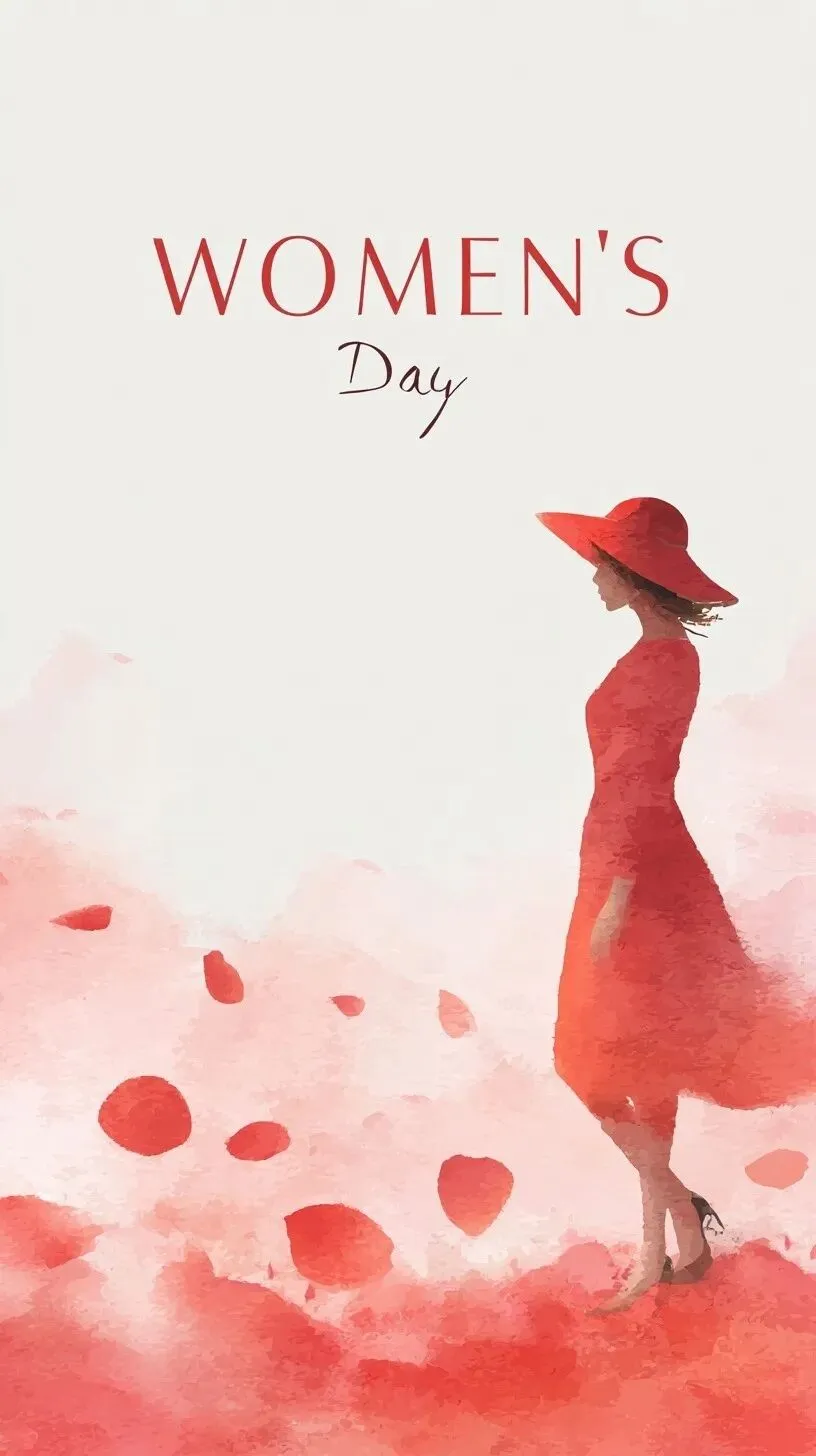 illustration of a women's day poster with the text Women's Day, featuring a simple and elegant design in a red color scheme. the poster depicts a female figure in a hat standing on rose petals, set against a pastel background with a watercolor effect, soft lighting, and delicate brushstrokes, resulting in a minimalistic and high-resolution design.