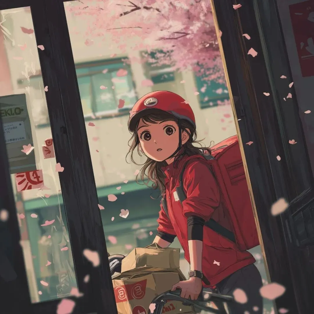 应用建议:此提示词构建出极具日式风情的外卖场景,可用于打造日式主题的动画短片情节,亦能作为日式生活美学相关的插画素材,妥妥适配日式清新风,拿来做壁纸或文创设计都很合适