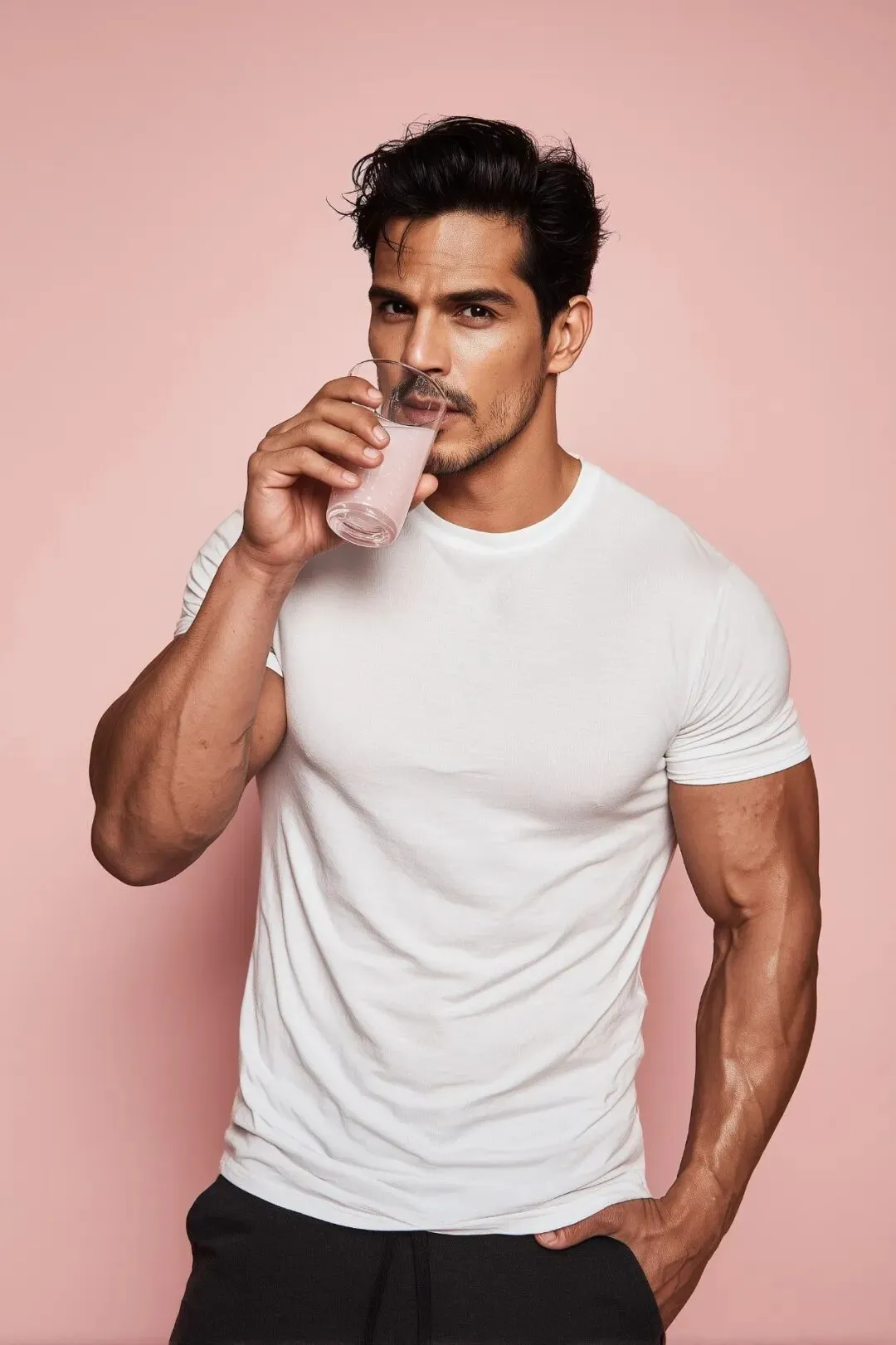 A muscular man, black hair in his early 30s with medium skin tone short styled black hair light stubble the same man appears twice with identical face and body standing back to back facing opposite directions one side he is doing a dumbbell bicep curl with a strong posture on the other side he is relaxed and drinking a pink collagen drink from a transparent water glass both wearing fitted white t shirts and dark gym pants clean studio background soft natural lighting realistic look