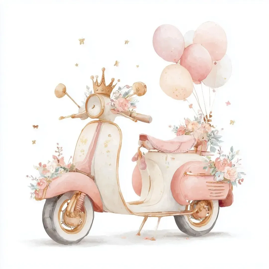cute pastel watercolor clipart, princess theme, cute motorcycle, soft pink and gold palette, dreamy, hand drawn, kawaii style, soft outline, minimal, isolated on white background, no shadow, high resolution