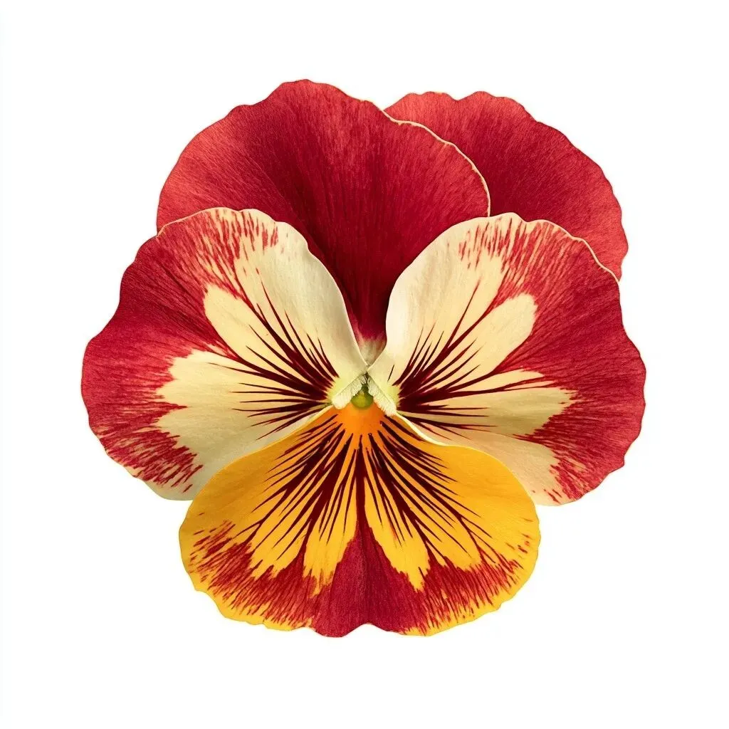 single red and yellow pansy flower, top view, high resolution, isolated on a white background