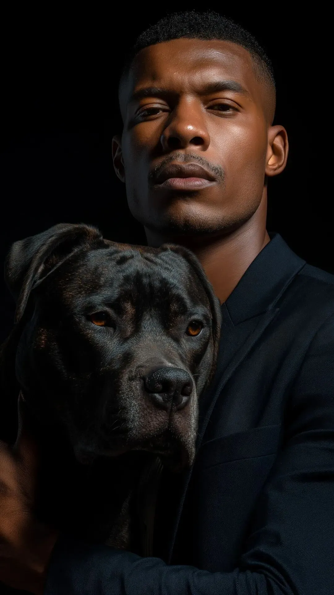 Full-body portrait of a handsome grown Black man holding a chrome adult pitbull, solid black background, spotlight from above, cinematic lighting, highly detailed, futuristic and surreal, photorealistic, dramatic shadows, powerful and elegant composition