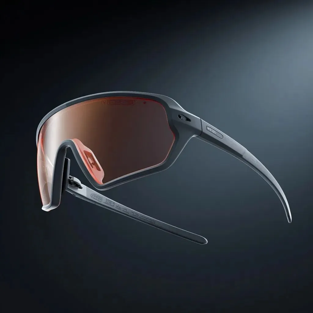Cycling sunglasses designed by industrial designers, full frame design, simple and elegant, with streamlined aesthetic design style, the product shape has a sporty muscular feel. Under studio lighting, the product is viewed from an upward angle