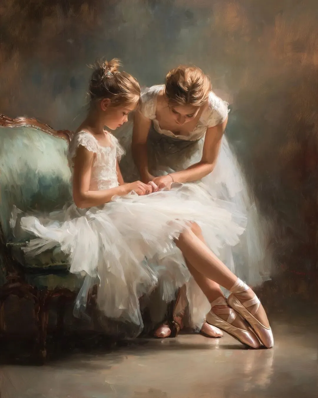 a girl in a white tulle dress putting on ballet shoes, sitting on the sofa and standing up to show her feet, another dancer is beside her helping with the shoes, in the style of artist pino daeni, with soft brush strokes, soft pastel colors, detailed painting, hyper-realistic, high resolution, natural lighting, a masterpiece, perfect composition, full-body portrait, and intricate details in oil paint.
