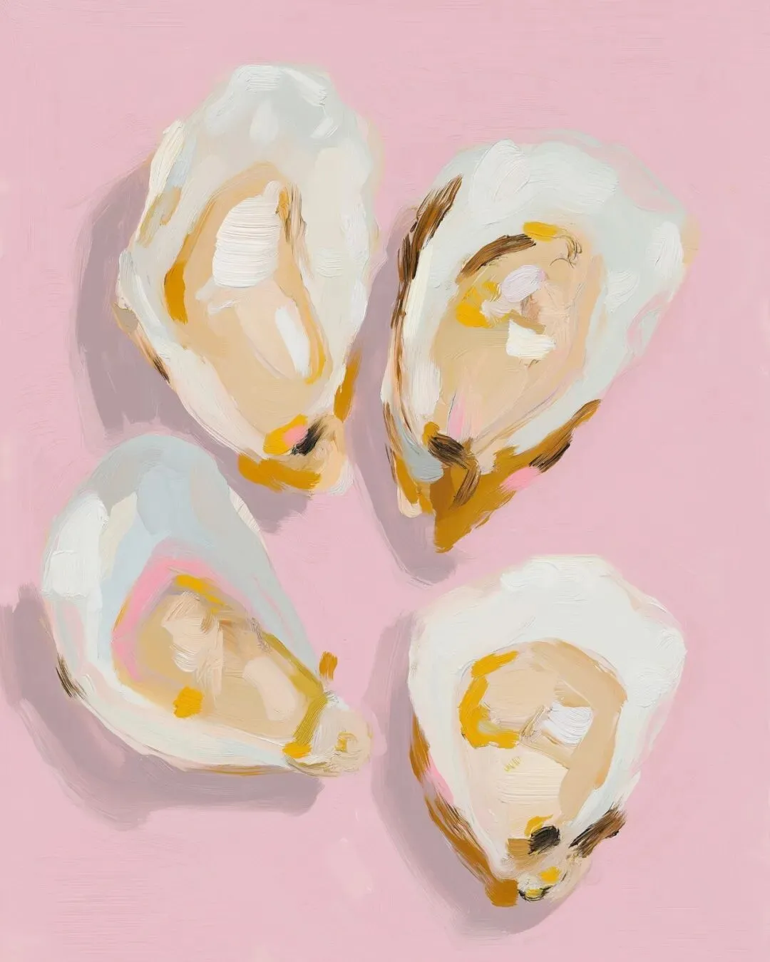 a minimalist watercolor painting of oysters in the style of maira kalman, using pastel colors, simple details, and a light pink background.
