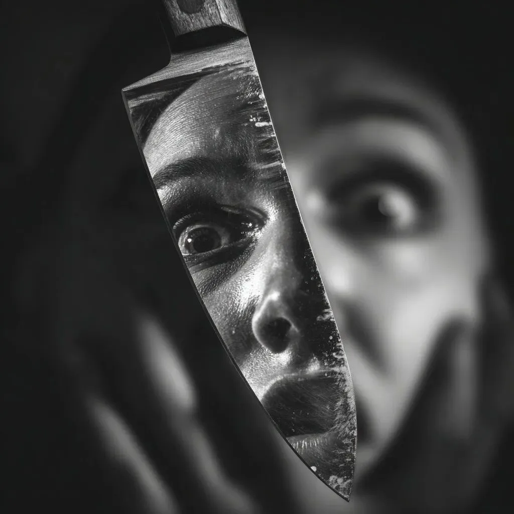 knife with reflection of women’s face in it, scared, pressed up to her cheek, black and white