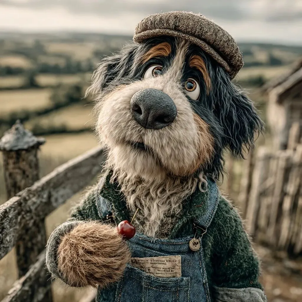 Anthropomorphic Bernese Mountain Dog standing in a rustic farm setting, wearing Kelly green coloured farmer’s clothing overalls, shirt, cap, holding and eating a bright red cherry, expressive and slightly playful expression, detailed fur texture, warm countryside atmosphere, wooden fences and rolling fields in the background, soft golden hour lighting, whimsical charm, cinematic composition, ultra detailed, depth of field, high realism with stylized character design, 8k