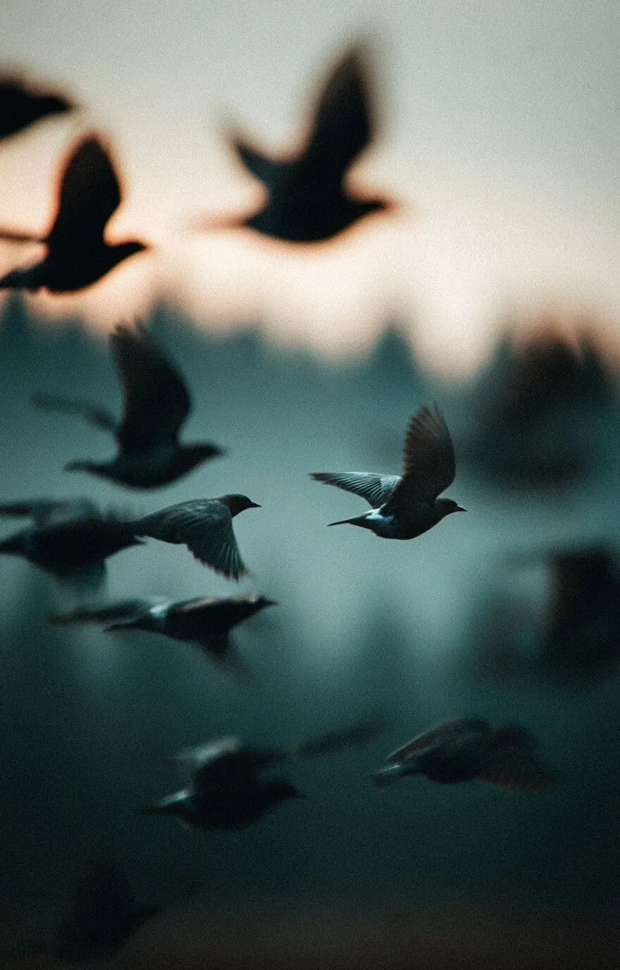 A group of birds are flying over the forest,sunlight coming through,long distance,in a minimalist style,,in the style of canon eos r5.real photos