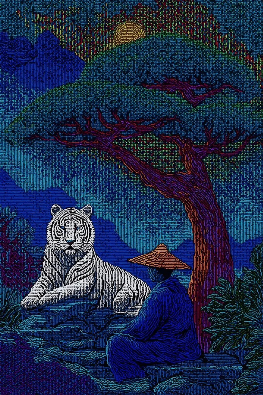 cloaked hooded monk sitting underneath a bonsai tree with a white tiger, bold popping colors, Cel-shading,