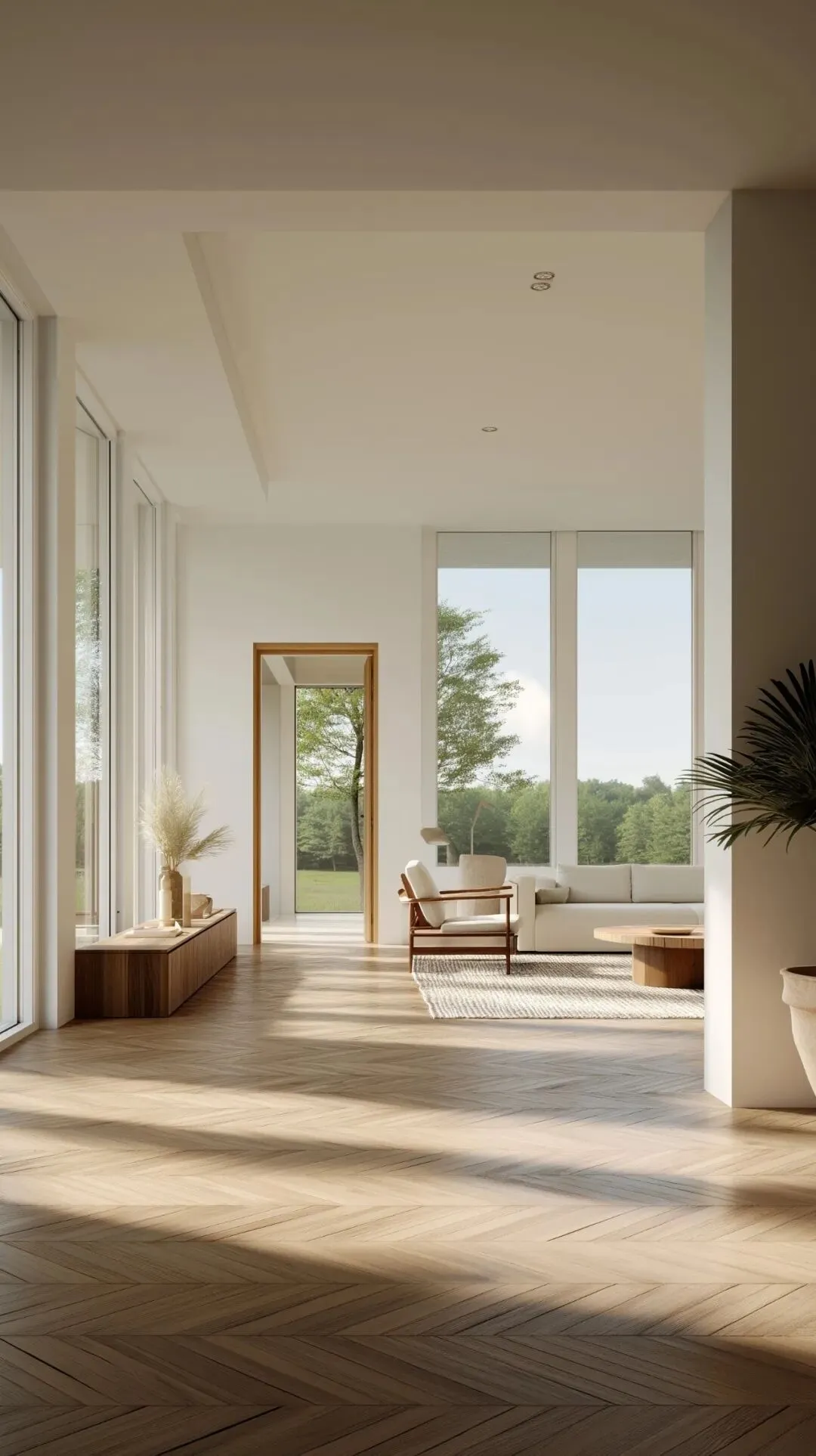 Modern interior design: The living room features herringbone parquet flooring, with an entryway door recessed into the wall. Floor-to-ceiling windows overlook lush green fields. White walls and wooden furniture flank either side of the room, leaving a spacious open area in the center. Minimalist style, modern lighting, natural light, warm atmosphere, wide-angle lens, architectural rendering, high-resolution photography, hyper-realistic. Centered composition.