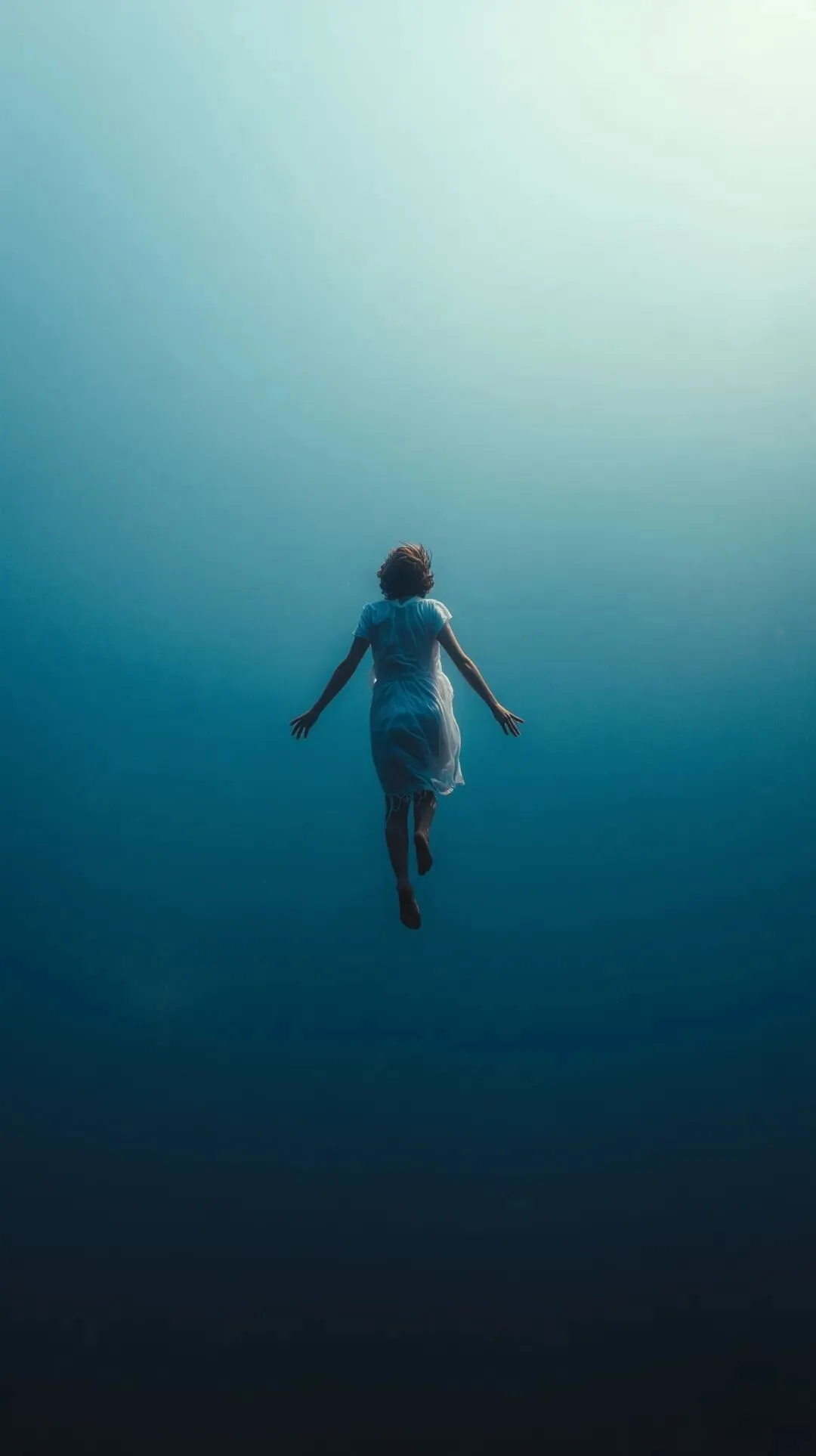 A gril falling to the void, wide shot, centered composition