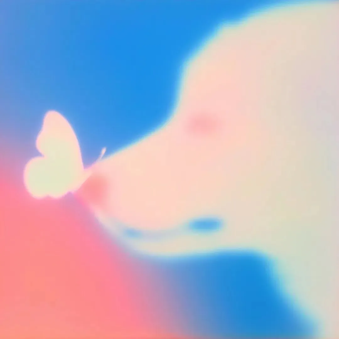 a butterfly sits on a dog's nose. only glowing silhouettes. Blurred composition.