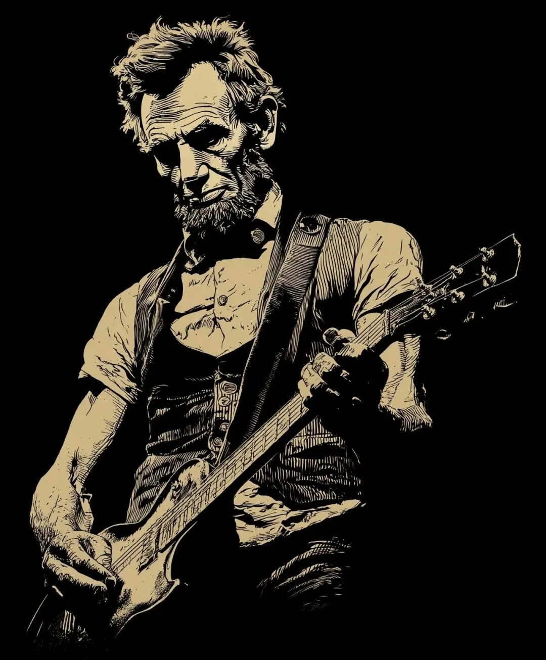 Original standalone shirt design featuring Abraham Lincoln as a gritty classic-rock guitarist, holding a vintage electric guitar in a guitarist pose, head slightly tilted down, focused performance energy, detailed 19th-century face with iconic beard, sleeveless waistcoat, rugged concert attitude, retro engraved illustration mixed with concert-poster art, monochrome sepia ink, strong silhouette, commercial POD design, isolated graphic on pure black background, no border, no background elements