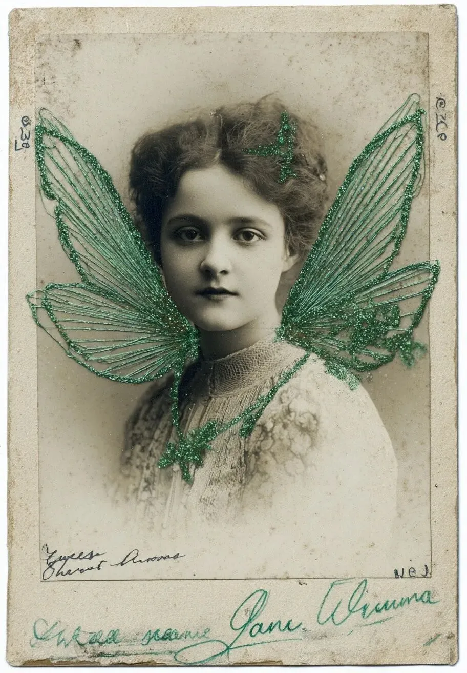 vintage photograph of an old photo card with green fairy wings and small, delicate green threads on the front, pasted in place at eye level as if they were real wings, isolated against a white background. a portrait of a french woman from early 20th century photography, with sweet gramma aine written below her head. green threads and emerald glitter surround her neck, giving the image a vintage feel.
