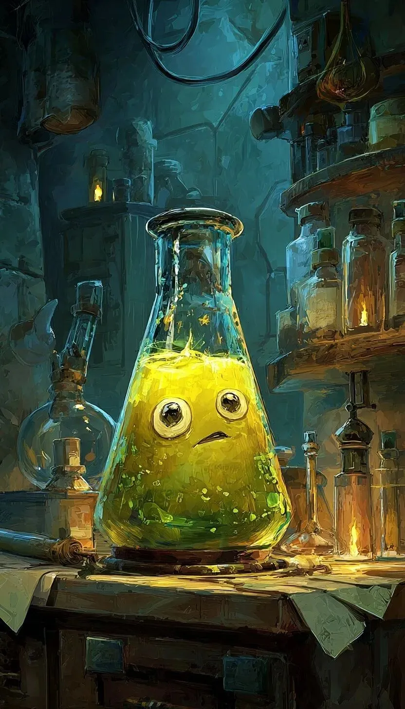 fantasy art, alchemist glas beaker with a liquid face is floating in the beaker, background alchemist lab,