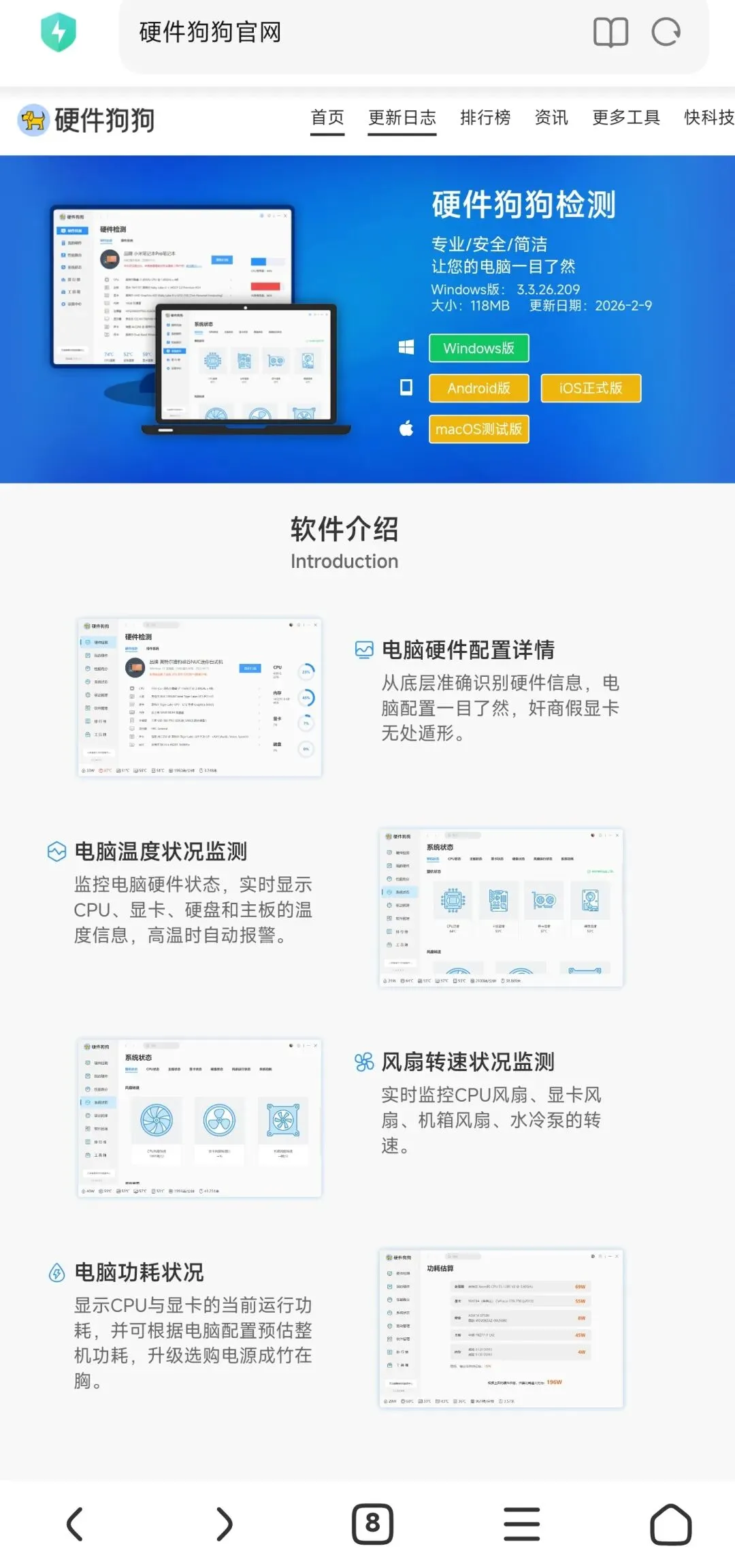 硬件狗狗支持多平台覆盖,满足不同设备需求:Windows 版 3.3.26.209(118MB,2026-2-9 更新)、安卓版 1.2.2、iOS 正式版 1.4.0、macOS 测试版 V0.0.5(31MB,支持 macOS11+)。