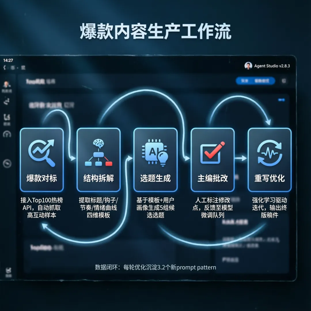 • 而是让它参与对标扫描、选题判断、提纲拆解、初稿生成、标题优化、复盘沉淀