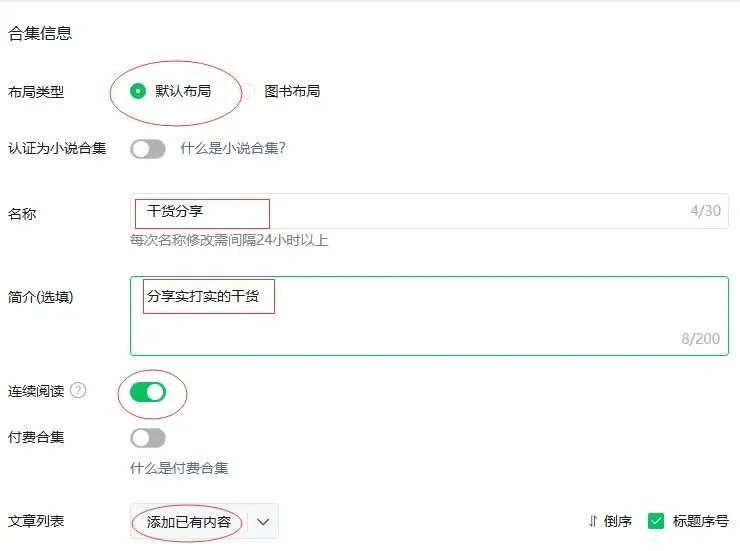 4. 选择【文章合集】后,填写合集名称、简介、上传封面图、打开【默认布局】,【连续阅读】按钮,【添加已有内容】