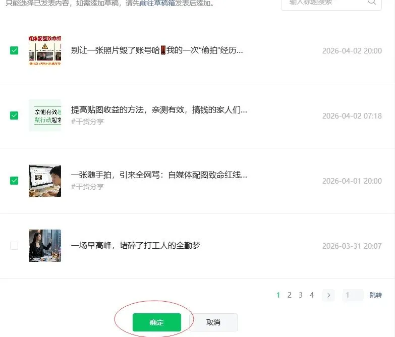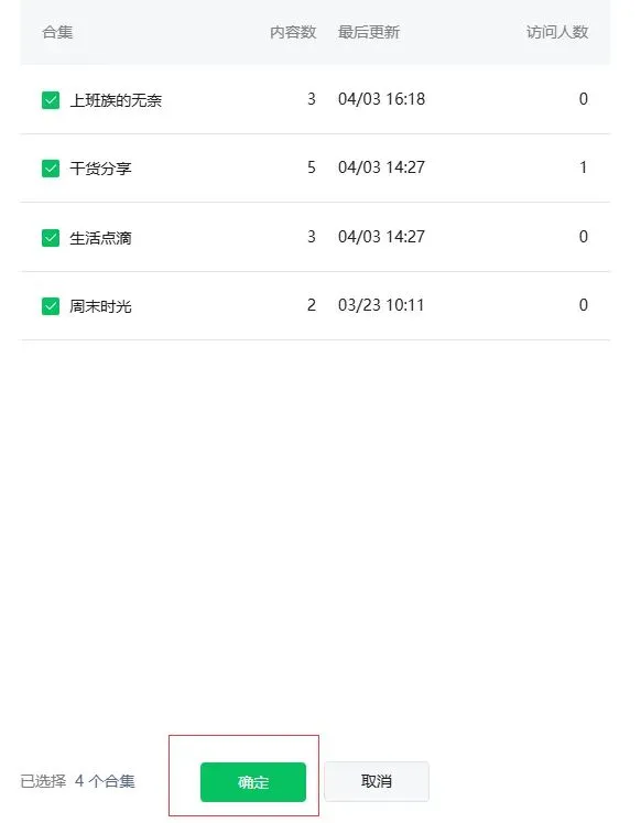 5. 点开【添加已有内容】后,勾选择之前已发表的文章,点【确认】后发布成功后,新合集创建完成