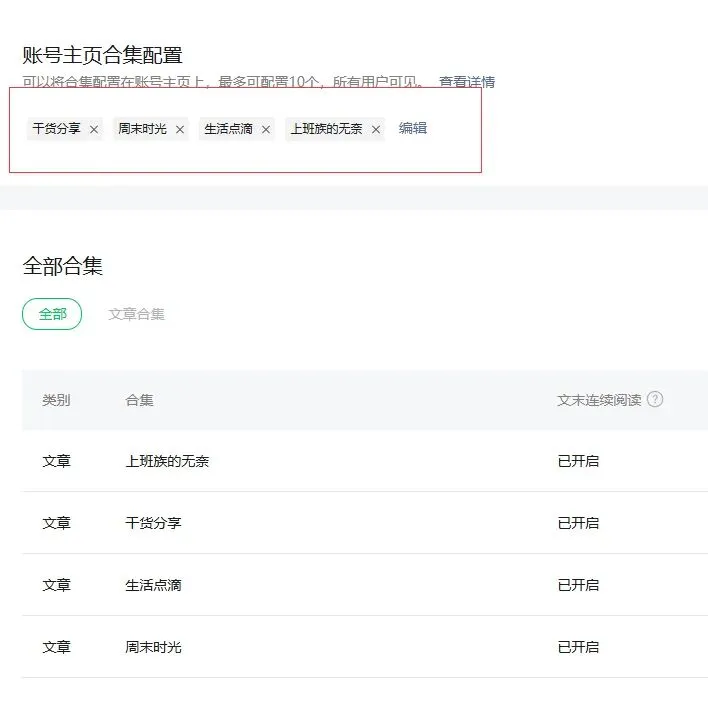 6. 想要合集显示在公众号主页,进入【账号主页合集配置],勾选需要展示的合集,再点【确定】后保存7. 保存之后合集会显示在公众号主页,粉丝打开主页后就能看到所有合集2. 进入已发表文章,点击文章右角的【...】后,选择【修改合集】3. 点开修改合集后弹出【创建合集】,在对话框里输入你想创建的合集【生活点滴】,点击【创建】后,新合集创建完成。4. 如果想将已发表的文章添加到已有合集,首先找到你想要添加的文章,点开右边【...】后,找到下方的【添加合集】5. 点开【添加合集】后,将此文章加入【生活点滴】后保存,6. 保存之后,创建合集将会显示在账号主页,这样就把你的文章归类成册了,粉丝阅读起来也方便以上就是公众号合集的完整开通和设置流程,不管是电脑还是手机,都能轻松搞定。其实运营公众号不用搞得很复杂,把内容整理清楚,方便读者查找,就是最实用的技巧。合集看似是一个小功能,却能让你的账号质感提升一大截。还没设置合集的朋友,今天看完就动手试试吧。如果操作中有不懂的地方,欢迎留言交流。觉得这篇教程实用,记得点赞,再看、收藏,也可以转发给一起做公众号的朋友,关注我,后续继续分享更多简单好用的公众号运营干货。