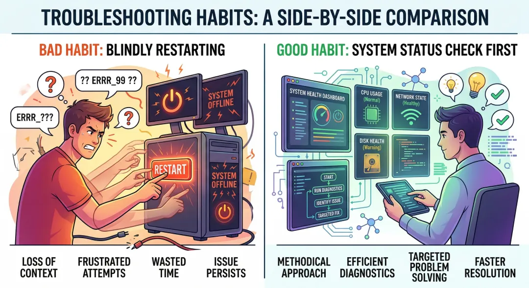 如果你总是一上来就 restart,你会越来越依赖碰运气,而不是建立真正的排查能力。