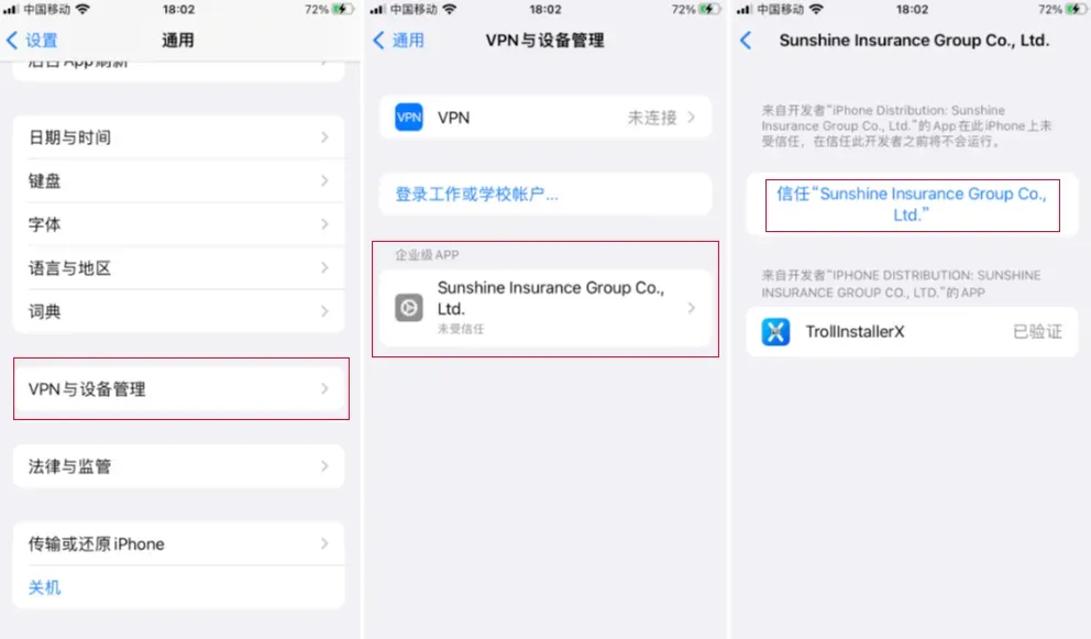 出现APP图标后,在设置-通用-设备管理中,对企业证书进行信任。