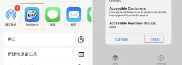 生成/替换成功后,打开对应的巨魔助手,在里面点击“install TrollStore”,安装巨魔商店。