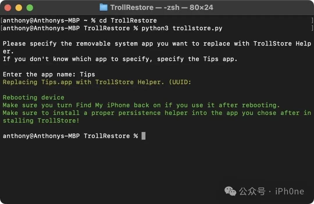 以便您可以在设备上安装TrollStore。等待命令完成,如下所示: