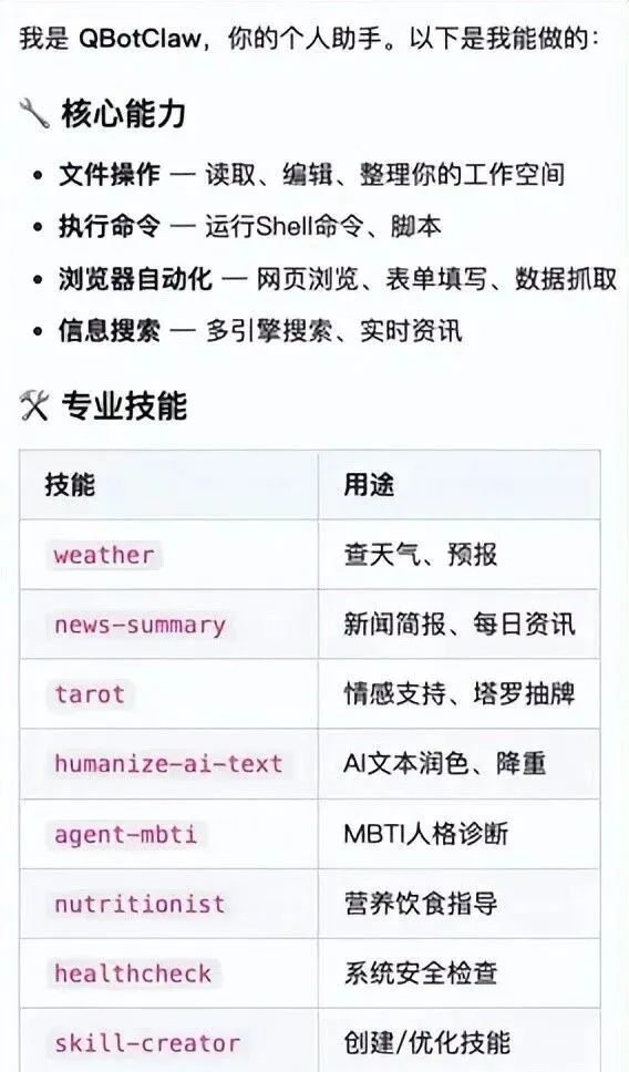 除了核心能力,QBotClaw还内置了8个专业技能,覆盖日常高频场景: