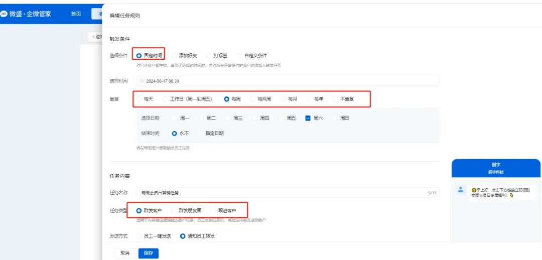 使用企业微信电脑版登陆 找到客户的联系方式 打开群发助手 选择客户或者标签 编辑内容 设置发送时间