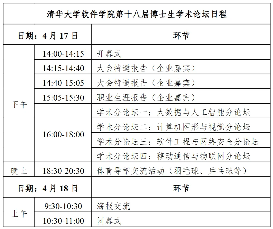 清华大学软件学院第十八届博士生学术论坛暨清华大学第830期博士生学术论坛定于4月17日至18日在清华大学自强科技楼2号楼举行。