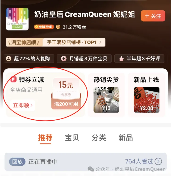 途径一:打开店铺首页,推荐页面,顶部即可领取;