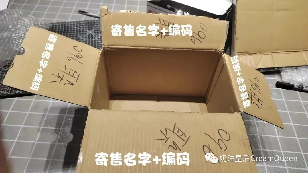 所有寄售来的姐妹,都必须在纸箱的四个耳朵内处,写好你的寄售名字和编码。