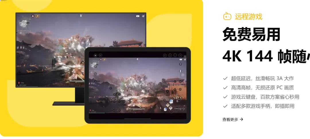 专为游戏优化,支持4K 144帧高清画质,超低延迟不卡顿,Xbox/PS/Switch手柄即插即用还带震动反馈,百款游戏云键盘预设,手机/平板也能体验端游的极致快感。